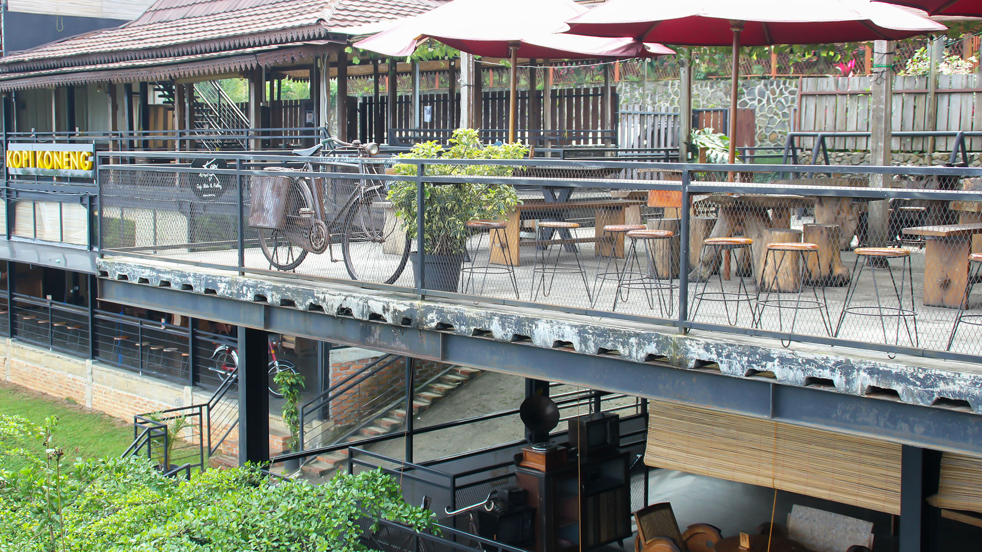 Kalau kamu suka ngopi sambil menikmati udara sejuk, Kopi Koneng Sentul bisa jadi tempat favorit barumu! Kafe ini ada di perbukitan Sentul yang asri, dengan konsep tradisional yang berpadu dengan suasana alam terbuka. Bangunannya didominasi kayu dengan desain sederhana, bikin suasananya hangat dan nyaman, pas banget buat kamu yang pengen melarikan diri sejenak dari hiruk-pikuk kota.