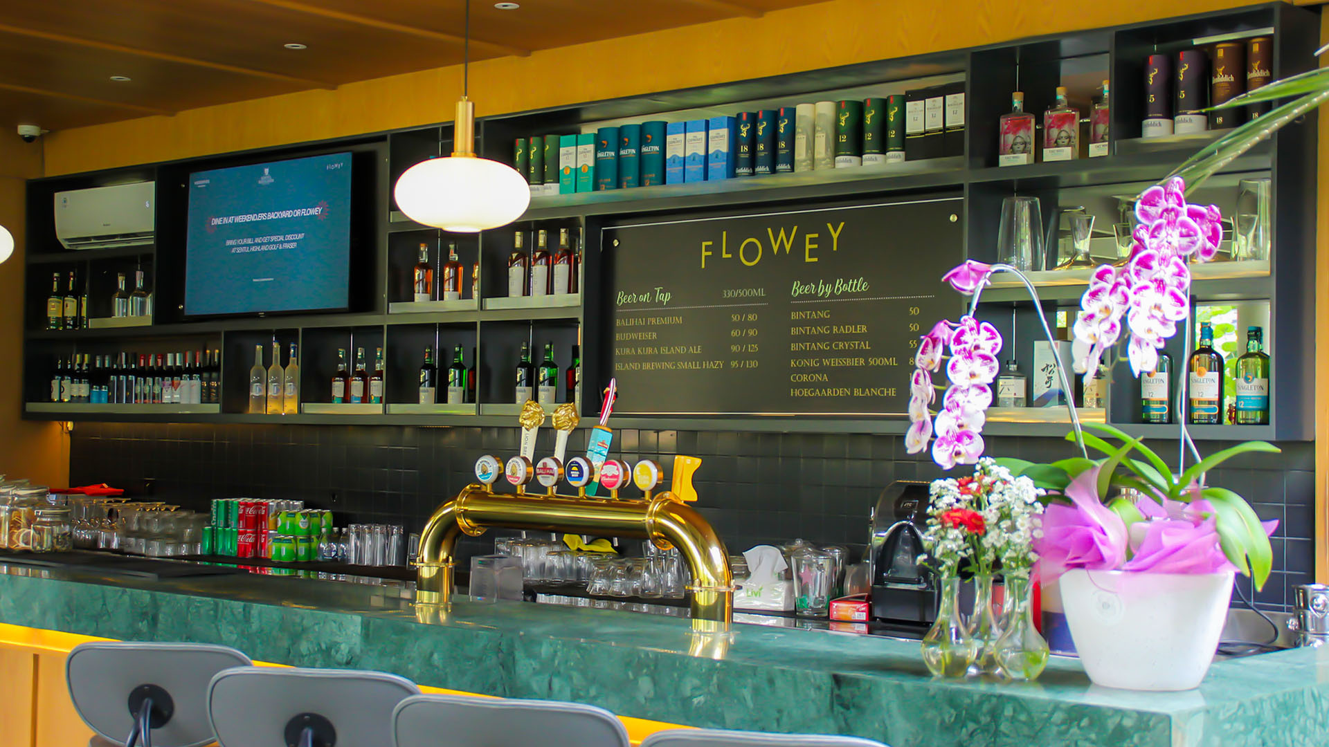 Flowey punya dua area yang bisa dipilih sesuai mood: indoor dengan desain modern yang nyaman buat kerja atau ngobrol santai, dan outdoor yang dikelilingi tanaman hijau serta bunga-bunga cantik, bikin vibes-nya fresh dan relaxing.