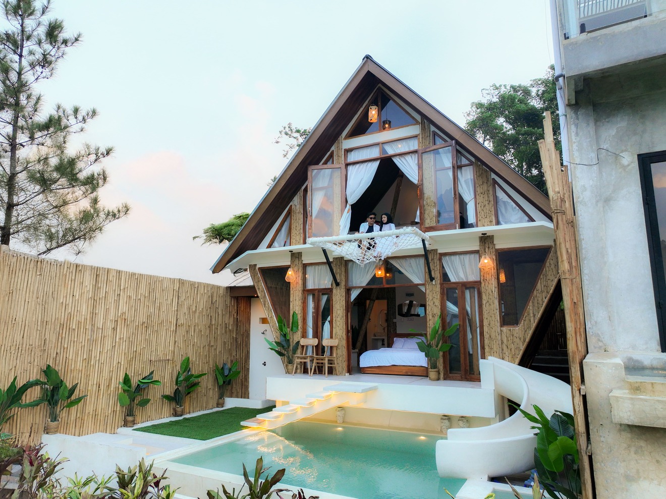 Slidehill Villa by Canvas Cottage di Bojong Koneng, Sentul City, jadi tempat ideal buat kamu yang mau rehat total dengan suasana sejuk, estetik, dan tenang. Dengan konsep vila modern tropis dan elemen kayu yang hangat, setiap sudutnya dibuat untuk healing—mulai dari kamar dengan view bukit, hammock net di balkon atas, sampai kasur utama yang bisa digeser langsung ke sisi kolam pribadi. Perosotan kecil di kolam renangnya juga bikin suasana makin fun dan memorable. Ditambah lagi, vila ini dilengkapi dapur pribadi, smart TV, Wi-Fi, hingga perlengkapan barbeque dan karaoke. Kalau kamu tipe yang suka private stay dengan suasana tenang dan udara bersih khas Sentul, Slidehill Villa jelas cocok banget buat short escape bareng orang tersayang.
